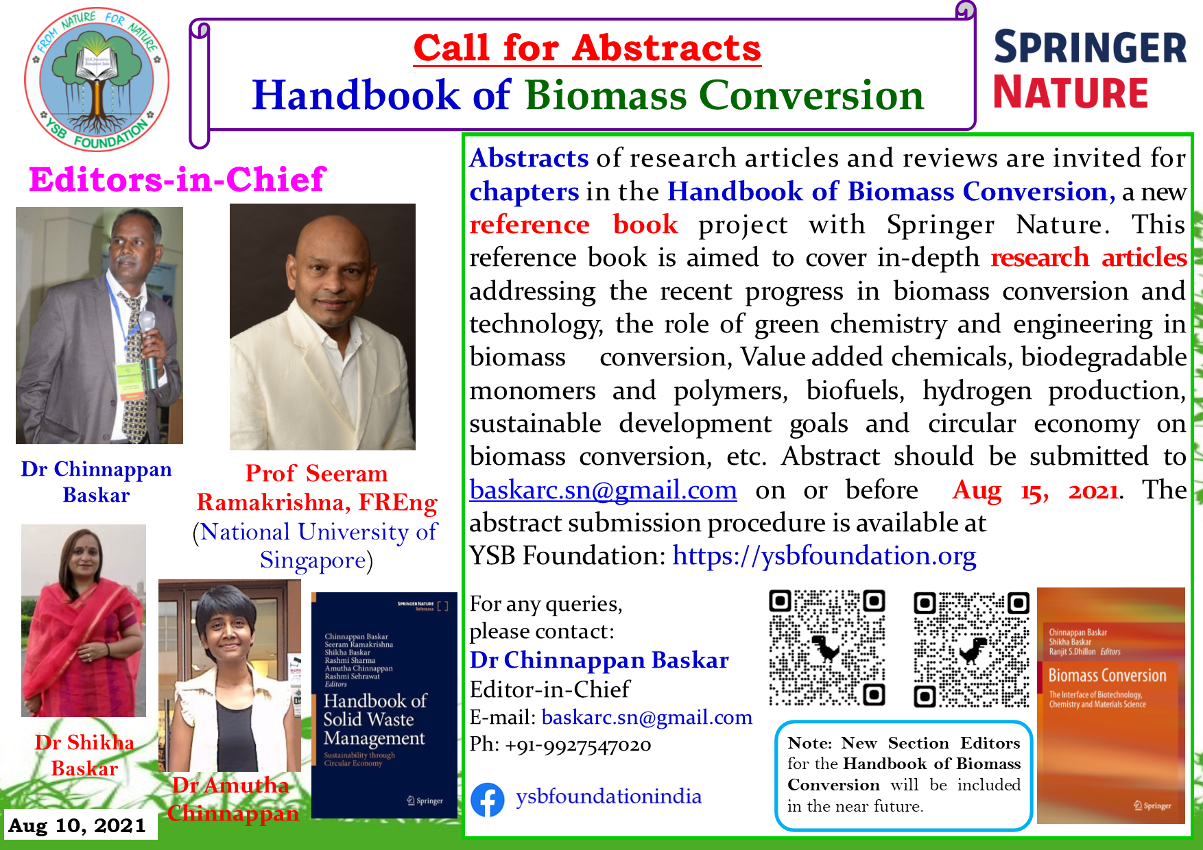 Abstracts of research articles and reviews are invited for chapters in the Handbook of Biomass Conversion, a new reference book project with Springer Nature. This reference book is aimed to cover in-depth research articles addressing the recent progress in biomass conversion and technology, the role of green chemistry and engineering in biomass conversion, Value added chemicals, biodegradable monomers and polymers, biofuels, hydrogen production, sustainable development goals and circular economy on biomass conversion, etc. Abstract should be submitted to baskarc.sn@gmail.com on or before Aug 15, 2021. The abstract submission procedure is given below.