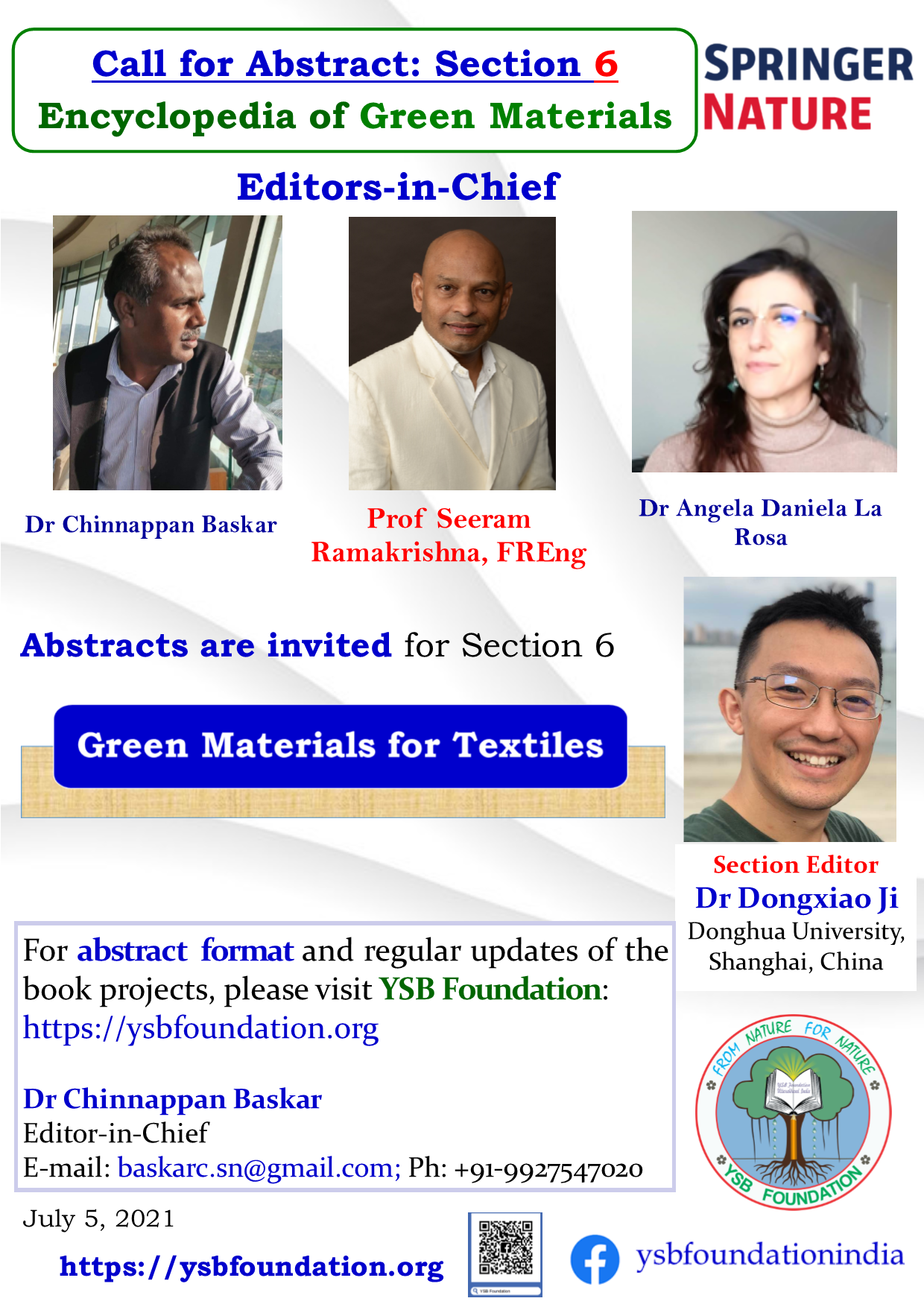 Abstracts are invited for chapters in Section 6: Green Materials for TextilesEncyclopedia of Green Materials, Springer Nature, Singapore.