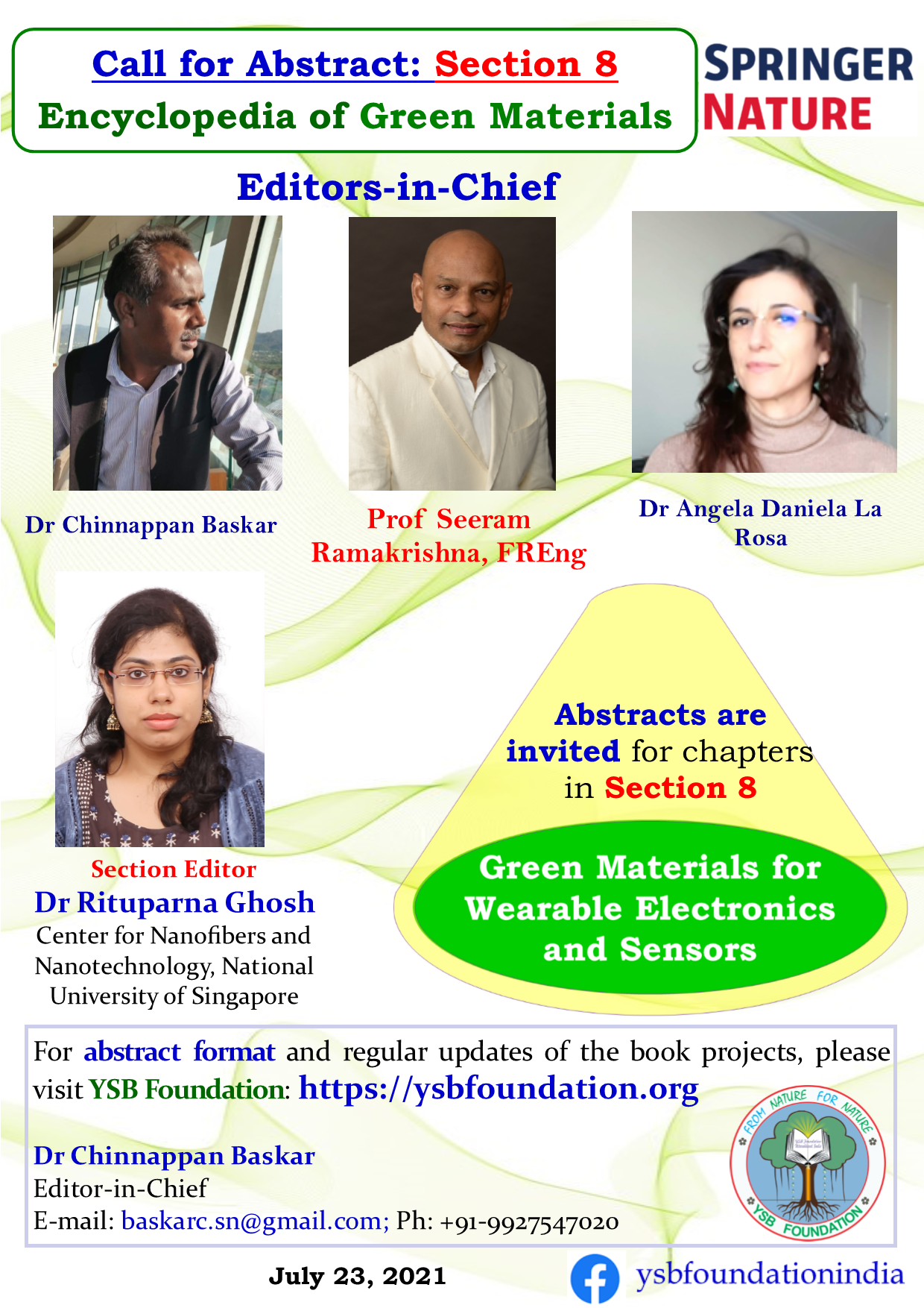 Abstracts are invited for chapters in Section 8: Green Materials for Wearable Electronics and Sensors of the Encyclopedia of Green Materials, Springer Nature, Singapore. The abstract submission procedure is given below.