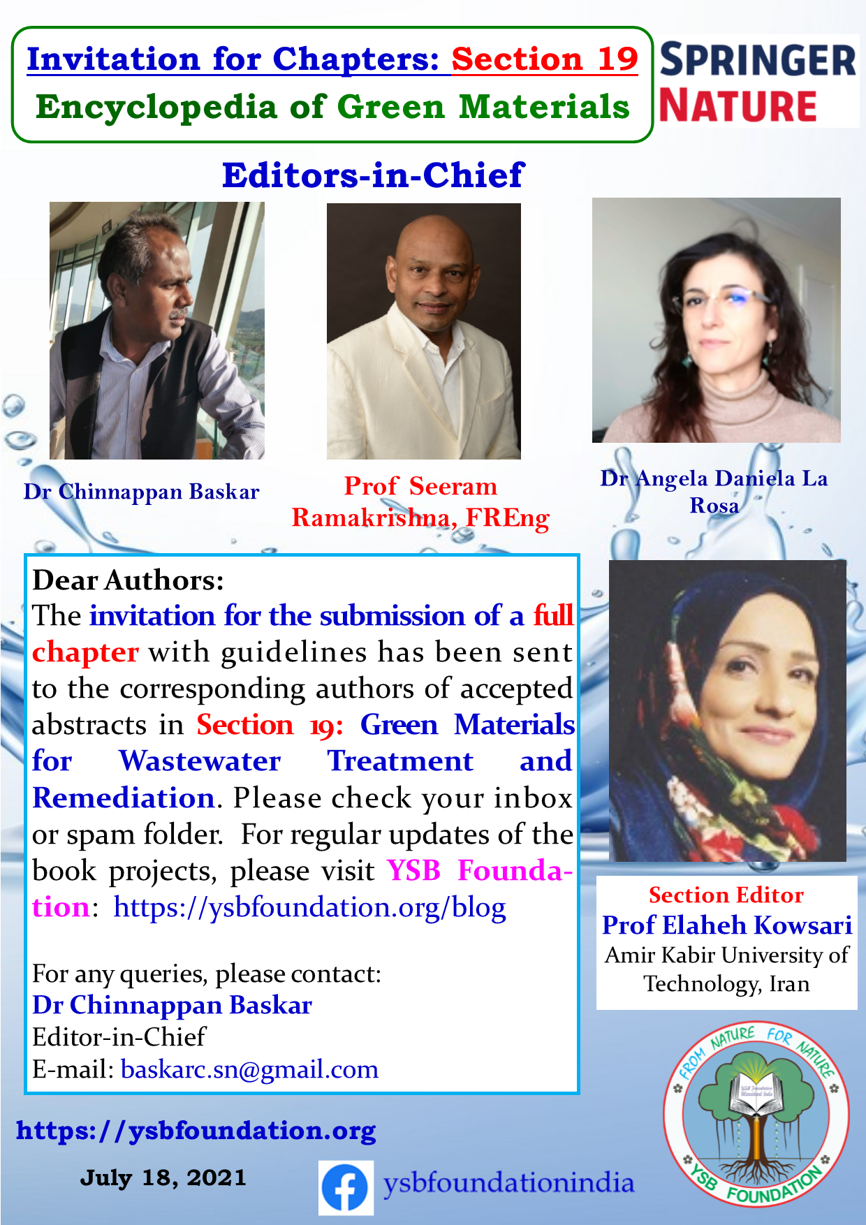 We are pleased to inform you that the invitation for the submission of a full chapter has been sent to the corresponding authors of the accepted abstracts in Section 19: Green Materials for Wastewater Treatment and Remediation of the Encyclopedia of Green Materials (Invitation sent by Springer Project Coordinator). Please check your inbox or spam folder. For regular updates of the book projects, please visit YSB Foundation: https://ysbfoundation.org/blog