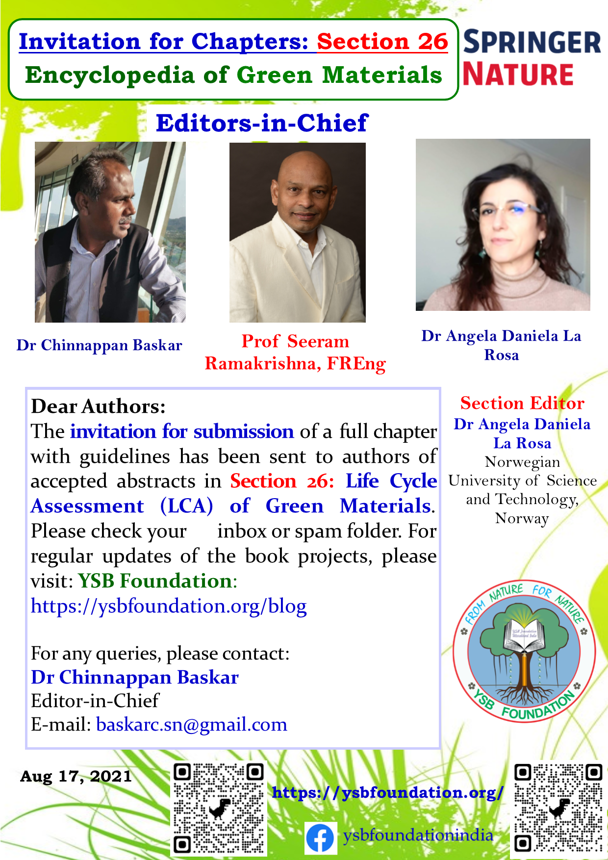 The invitation for submission of a full chapter with guidelines has been sent to authors of accepted abstracts in Section 26: Life Cycle Assessment (LCA) of Green Materials of the Encyclopedia of Green Materials. Please check your inbox or spam folder. So far we have sent the invitation to authors of accepted abstracts in Section 3, Section 7, Section 9, Section 10, Section 14, Section 19, Section 23, Section 24, Section 26, and Section 27. The invitation for Section 28 is in progress.